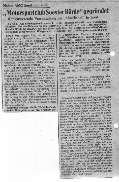 Am 03. Dezember 1955 wurde der Motor Sport Club Soester Börde, in Soest, in der Gaststätte "Mönchshof" gegründet. Es wurde Herr Dr. Heinz-Otto Trockels zum ersten 1. Vorsitzenden gewählt. Der 2. Vorsitzende wurde Herr Herbert Feuereis. Zum ersten Sportleiter wurde Herr Walter Schulte gewählt. Herr Alois Isenberg übernahm das Amt des Schatzmeisters des MSC. In den Posten des Schriftführers wurde Herr Hanshelmut Zimmer- mann gewählt. Als 1. Beisitzer wurde Herr Willi Stuckmann und als 2. Beisitzer Herr Erhard Rosenfeld gewählt.