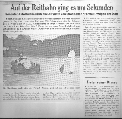 1963 wurde der erste Automobilslalom des MSC Soester Börde auf der Reitbahn in Soest durch- geführt. Der Club war der erste Verein in Nordrhein-Westfalen, der einen Automobilslalom durch- geführt hat. In den Jahren waren zahlreiche Autos am Start, unteranderem auch Formel 1 Fahrzeuge wie in der Bildgalerie zu sehen. Von der Reitbahn wechselte man in den Jahren nach Lippstadt und danach in die Graf-York-Kaserne nach Echtrop.