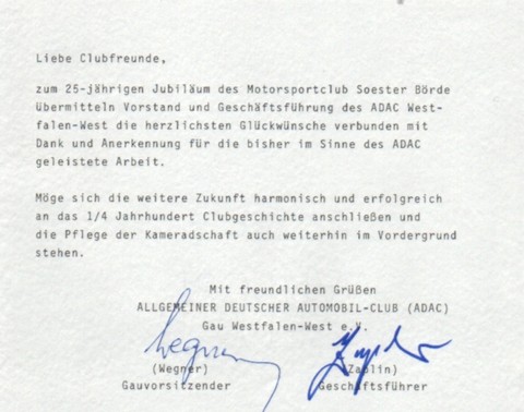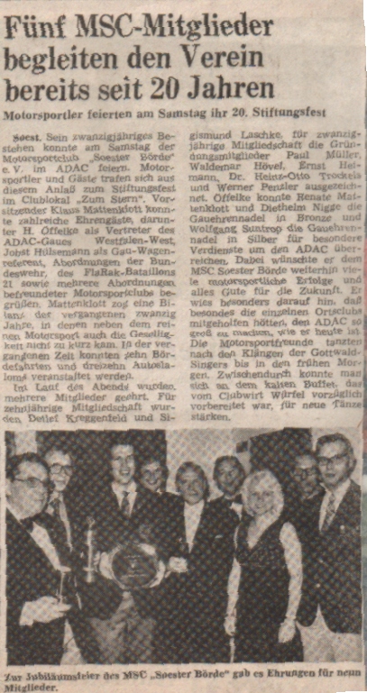 1980 bestand der Club nun schon 25 Jahre. Dieses wurde mit einer großen Feier im Bürgerhaus Bad Sassendorf gefeiert. Es waren viele Ehrengäste, unter anderem der 2. Vorsitzende des ADAC Gau-Westfalen West, Herr Hans Werner Leukel, anwesend und überbrachten dem Club ihre Glückwünsche.