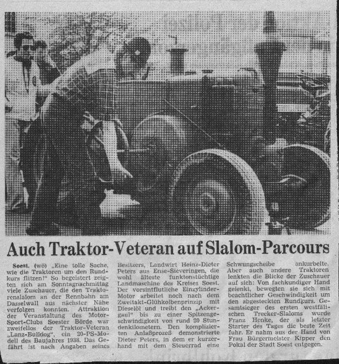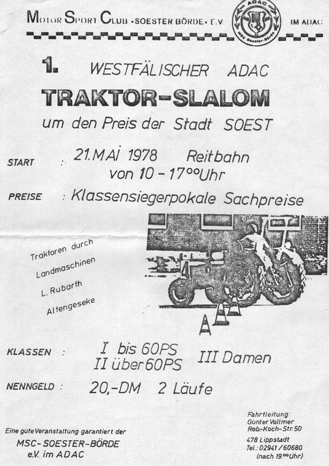 Am 21.05.1978 wurde der 1. TRAKTOR Slalom auf der Reitbahn in Soest durchgeführt.